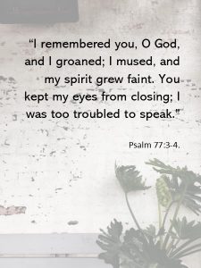 Starting in Psalm 77:10, you begin to see a transition of the heart attitude where Asaph begins to remember the good works, “Then I thought, ‘To this I will appeal the years of the right hand of the Most High. I will remember the deeds of the Lord; I will meditate on all Your works.’ ” In the English Standard Version, the verse reads, “I will remember your wonders of old.” And in the New Living Translation, “I recall all you have done, O Lord.” I forgot to remember what God had already done in my life… and perhaps was still doing.